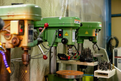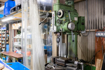 直立ボール盤は、垂直方向に回転するドリルで穴あけ加工を行う工作機械です。金属や樹脂、木材など幅広い素材に対応でき、正確な位置決めと深さ制御により高精度な穴あけが可能です。速度や送りの調整が容易で、サイズや形状の異なる穴加工にも柔軟に対応できます。